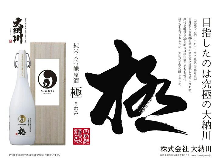 "究極の大納川"をテーマに杜氏・佐藤好直が自身初となる25%精米の酒造りに挑戦した希少なお酒です。 蔵付き酵母D-29を使用し、酒米には秋田酒こまちを使用。 我が子を育てるように、 大切に丁寧に醸しました。